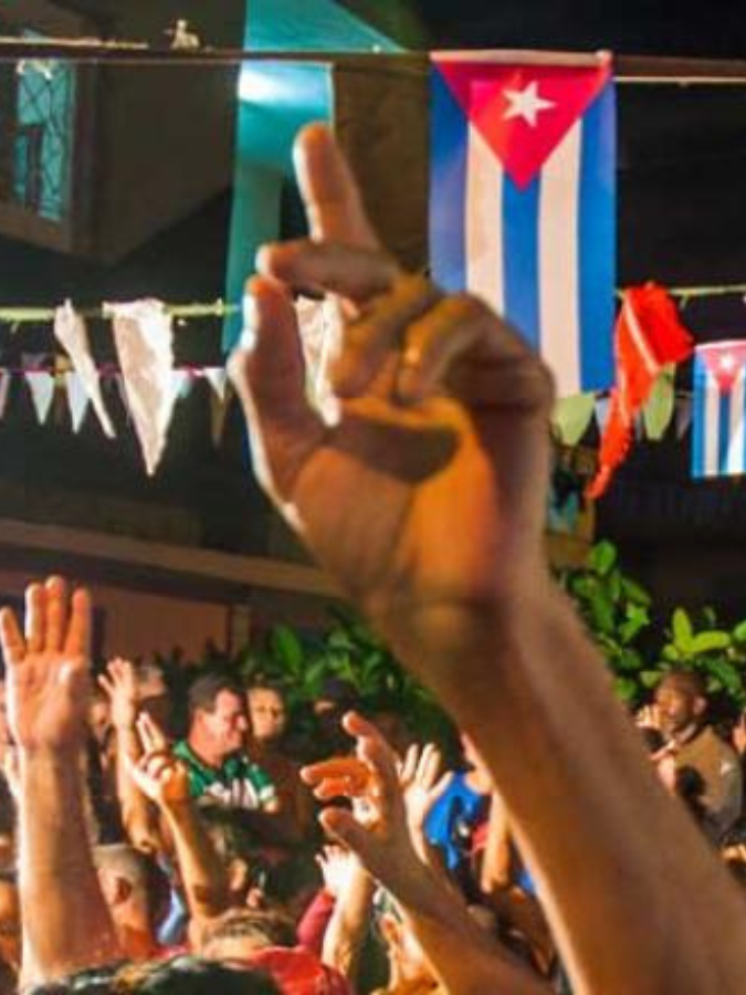 Cuando subimos al portal de la tienda, con su viejo alero de tejas y sus columnas añosas pero firmes, ya el delegado estaba ahí. La electricidad había llegado al reparto minutos antes, prendiendo los bombillos y la algarabía de la noche. El delegado se ubicó tras la mesa, a su lado la bandera; junto a ella, sujeto a la pared, el Escudo Nacional. El delegado alzó la mano invitando al silencio, miró su reloj y pidió, con voz fuerte y segura, cantar el Himno de Bayamo.