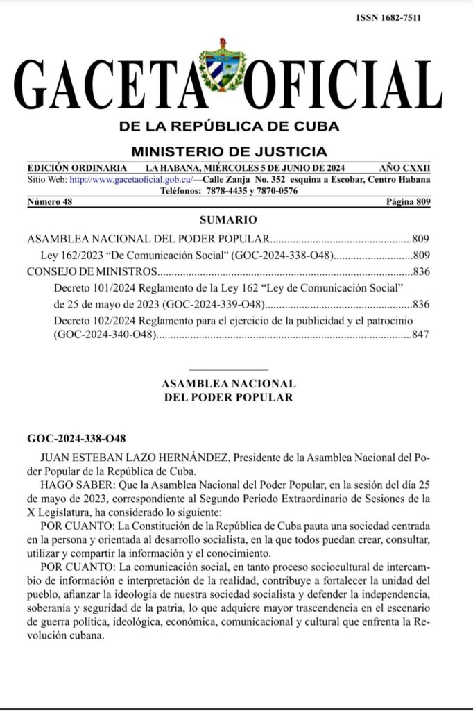 La Ley de Comunicación Social cubana, aprobada en la Décima Legislatura de la Asamblea Nacional del Poder Popular, el 25 de mayo de 2023, ya se encuentra publicada en la Gaceta Oficial de la República de Cuba.
